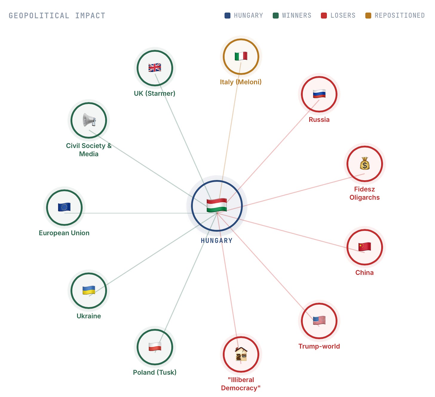 A political earthquake in Hungary is the perfect opportunity for our Unruly Corp. AI tools to analyze what this means for the EU member state, as well as who the global winners and losers are. We generated this report within hours of the election along with visualizations. The system identified the expected winners and losers of Viktor Orbán’s defeat, but also surfaced less obvious dynamics. It assessed the outcome as negative for China, though as significantly as maybe conventional wisdom would say; and it highlighted that the implications for Italy’s prime minister, Giorgia Meloni, are mixed, as she now emerges as the leading far-right political figure within the EU. Readers may disagree with specific conclusions of the full report below. However, as an exposition, this effort illustrates that properly structured AI systems can produce rigorous, high-quality geopolitical analysis comparable to that of experienced practitioners.