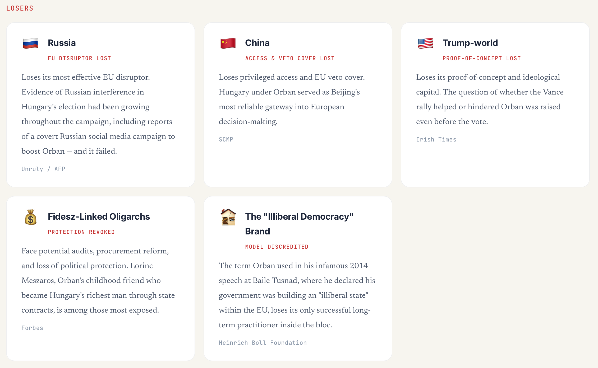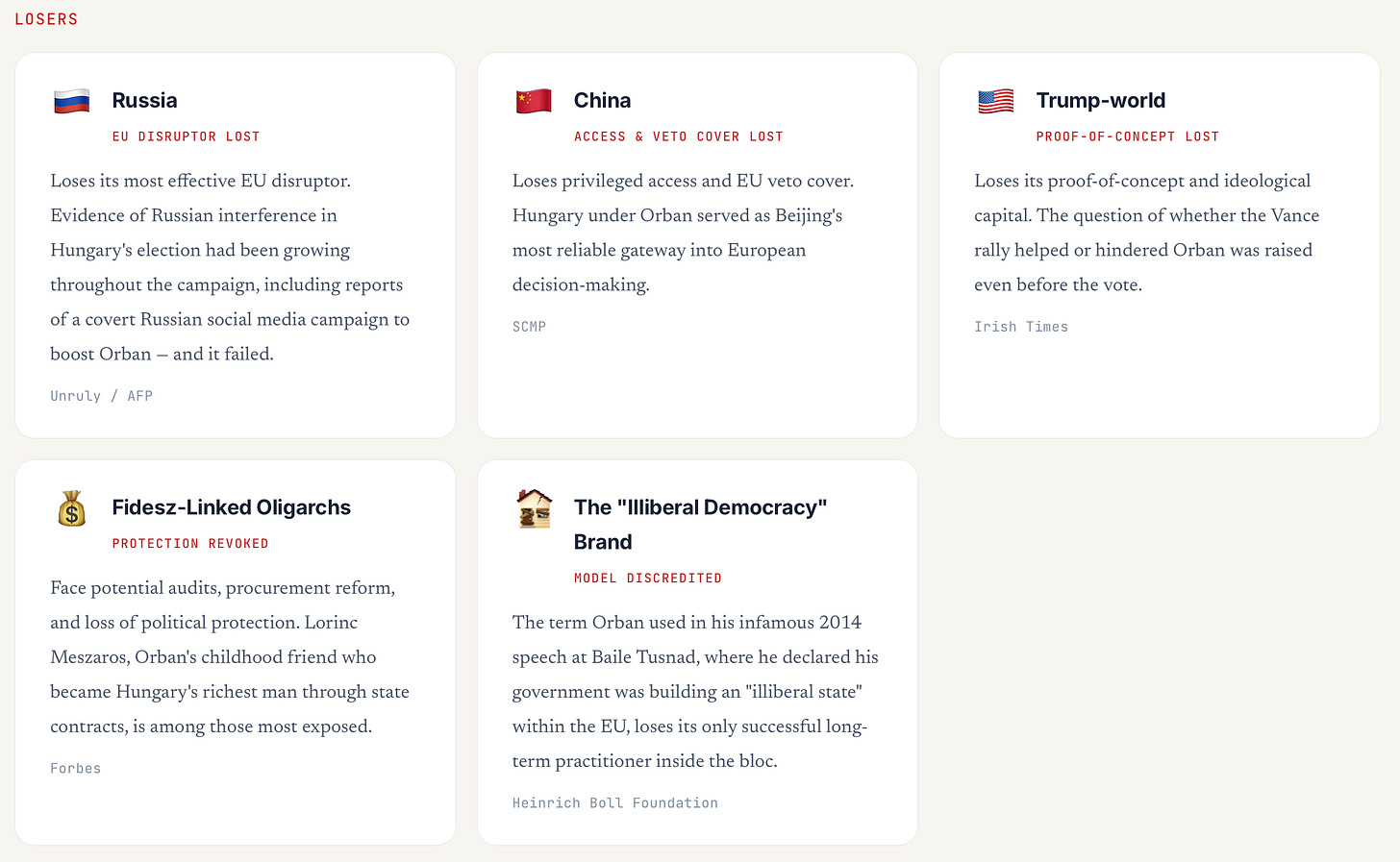 Russia — loses its most effective EU disruptor. Evidence of Russian interference in Hungary’s election had been growing throughout the campaign, including reports of a covert Russian social media campaign to boost Orbán (Unruly / AFP), and it failed.
