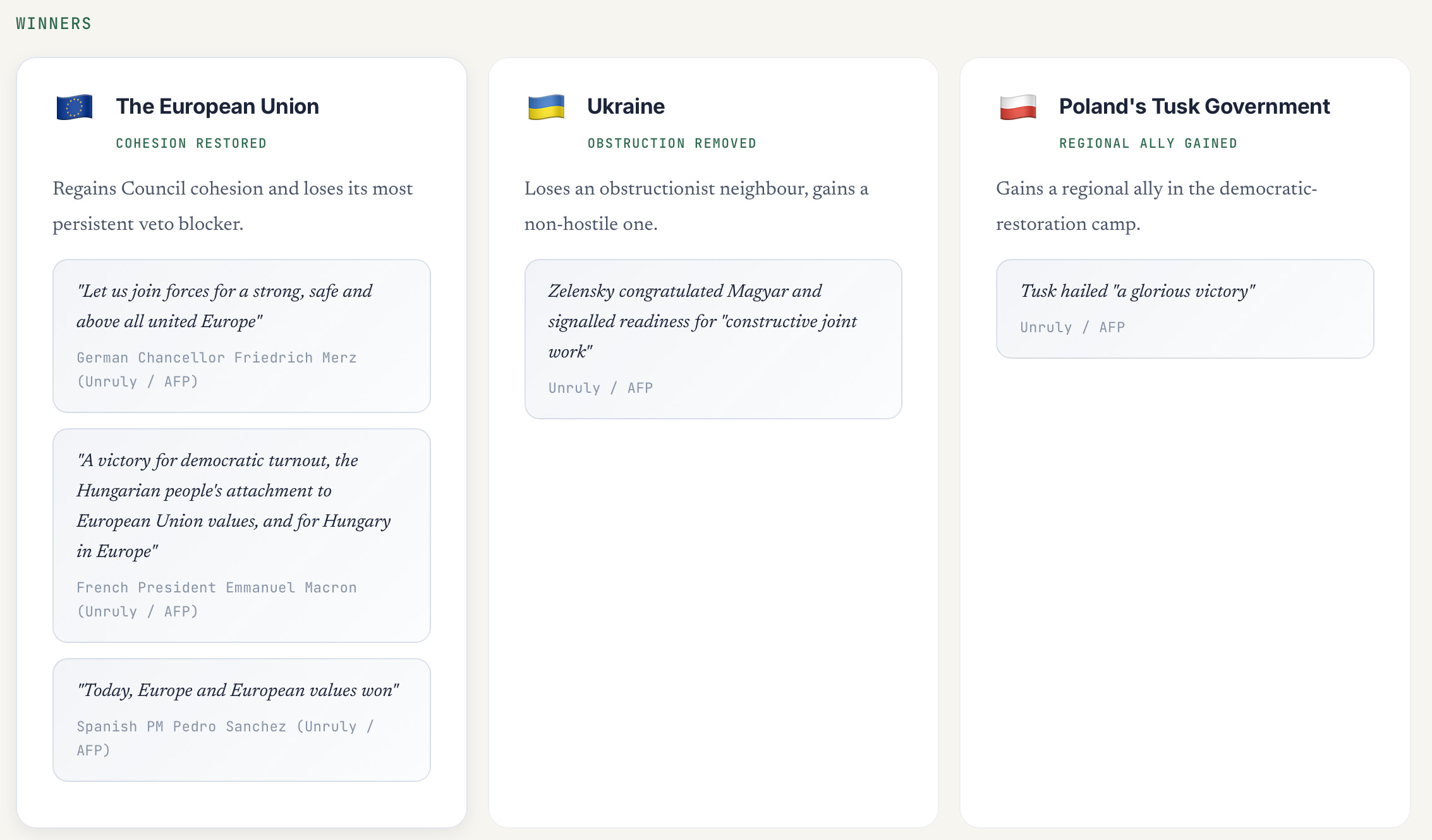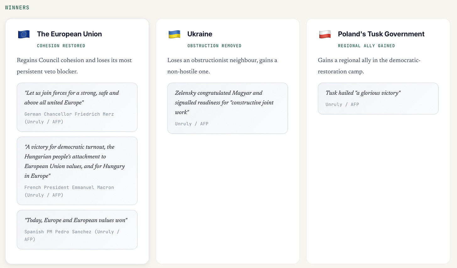 The European Union — regains Council cohesion, loses its most persistent veto blocker. German Chancellor Friedrich Merz wrote: “Let us join forces for a strong, safe and above all united Europe” (Unruly / AFP). French President Emmanuel Macron hailed “a victory for democratic turnout, the Hungarian people’s attachment to European Union values, and for Hungary in Europe” (Unruly / AFP). Spanish PM Pedro Sánchez declared: “Today, Europe and European values won” (Unruly / AFP).