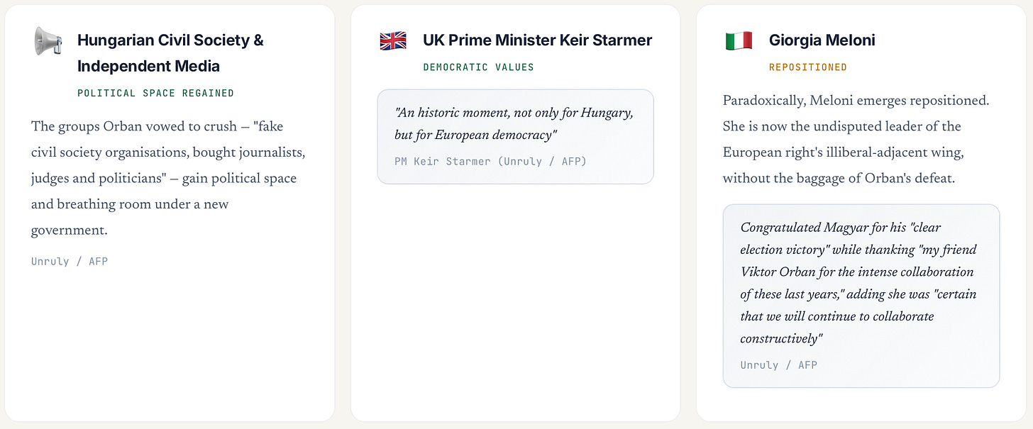 Giorgia Meloni — paradoxically, Meloni emerges repositioned. She congratulated Magyar for his “clear election victory” while thanking “my friend Viktor Orbán for the intense collaboration of these last years,” adding she was “certain that we will continue to collaborate constructively” (Unruly / AFP). She is now the undisputed leader of the European right’s illiberal-adjacent wing, without the baggage of Orbán’s defeat.